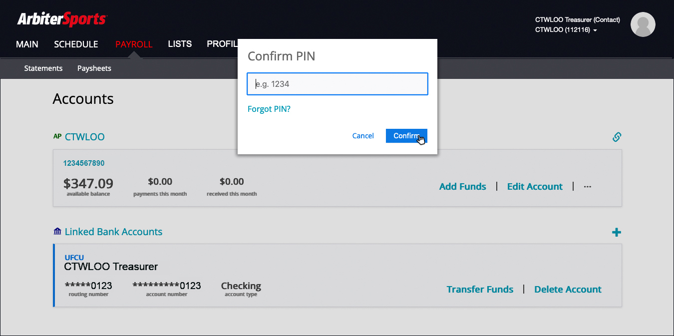 NOTE: Be sure to save your Team's ArbiterPay 4 Digit PIN. This PIN will stay with the account and need to be passed on to the next Treasurer or whoever is responsible for paying through ArbiterPay.