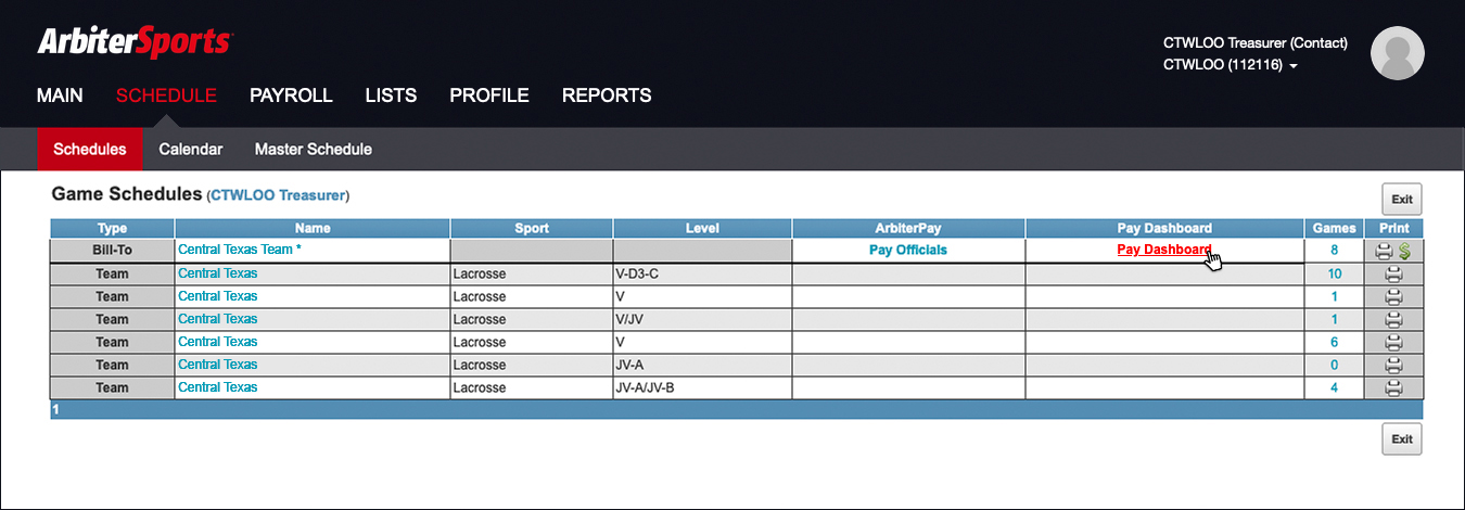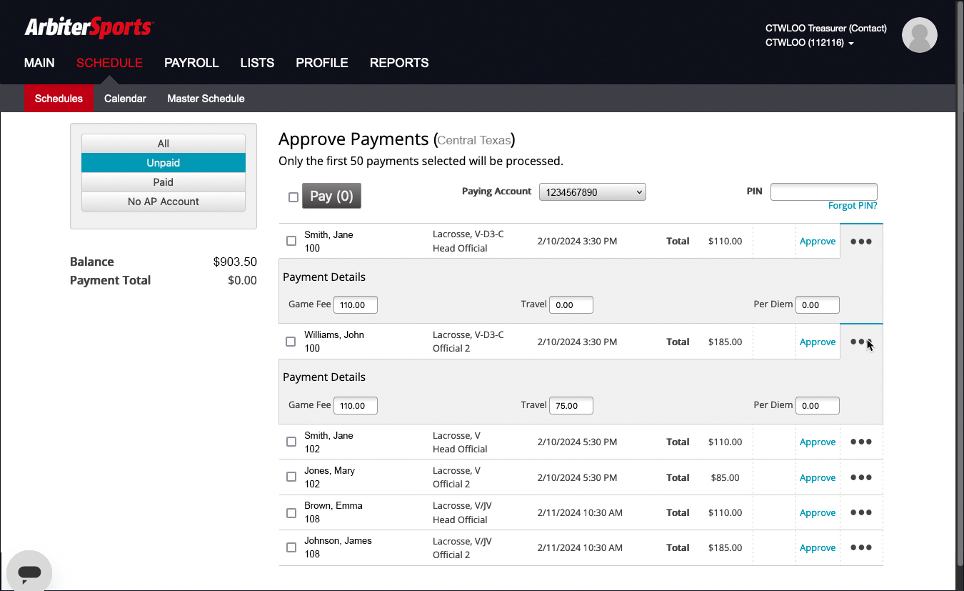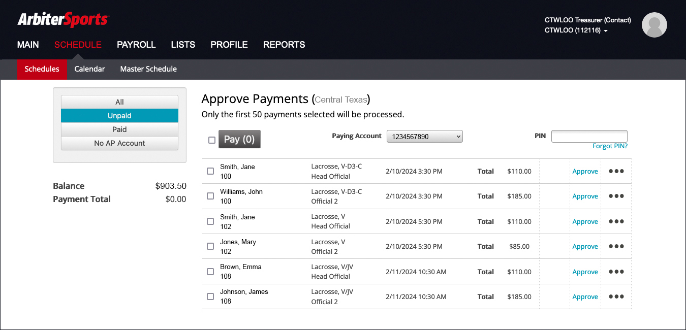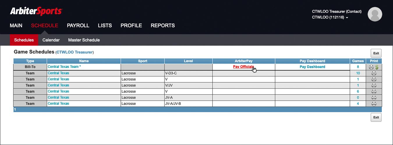 If you have an ArbiterSports account with access to CTWLOO and your team's schedule but do not see the option to "Pay Officials," email Treasurer Rachel Gozhansky at treasurer@ctwloo.org and Assigner Johanna Owens at assigner@ctwloo.org to let them know you should have the ability to see and manage payments to officials.