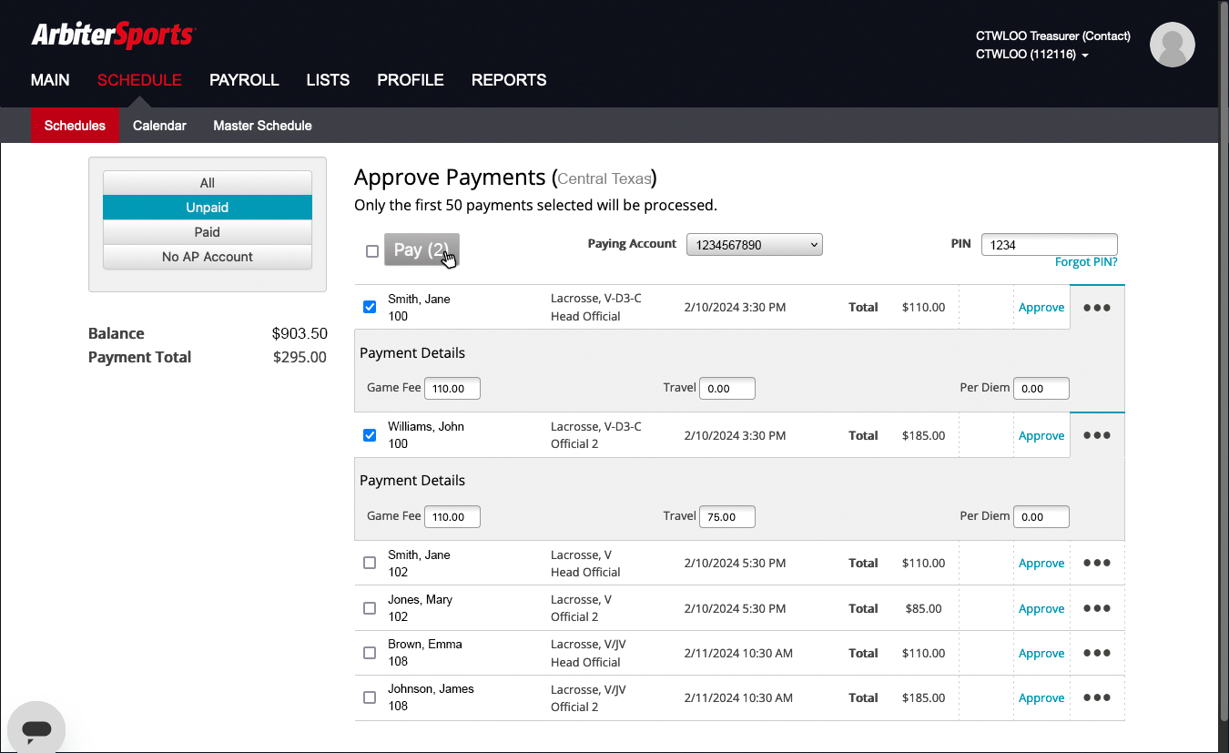 Check the box next to the officials you want to pay. Enter your PIN and then click Pay.