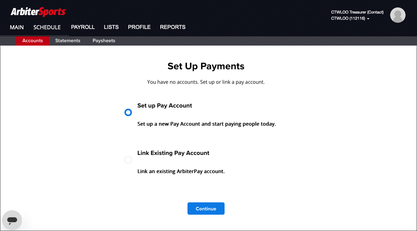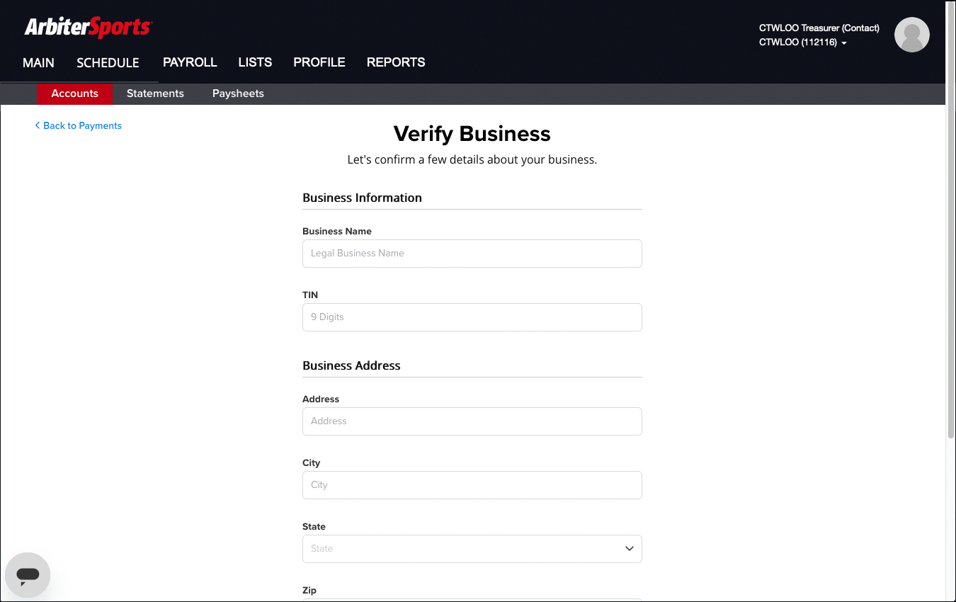 NOTE: ArbiterPay is a separate account from ArbiterSports so if you have not previously set up an ArbiterPay account for your program you will need to do that first: Setting up a New ArbiterPay Account.