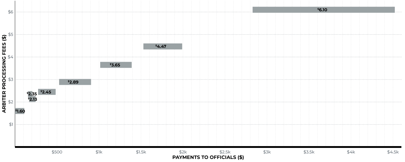 CTWLOO has been unable to find or figure out the formula for the fee calculation. However, CTWLOO issued 50 payments to officials through ArbiterPay during 2023. Below we are sharing the data collected on the payment ranges and the corresponding fees we paid to help teams prepare.